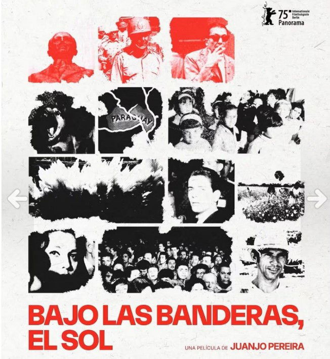 Bajo las banderas el sol, de Juanjo Pereyra es un film que se pensó como la oportunidad de utilizar la pantalla grande para reflexionar sobre lo que significaron los años de dictadura de Stroessner y saldar con él una deuda pendiente con la memoria de su país. Así es como a través de una edición que procesó casi 140 horas de material audiovisual aportado desde diferentes geografías (tales como Francia, Alemania, Rusia, Japón, Brasil y Argentina) y un derrotero por los festivales más importantes del mundo lo volvieron una propuesta interesante para todos aquellos que quieran entender cómo se implementó el proceso de las dictaduras latinoamericanas de fines del siglo veinte e indagar en los casos particulares de cada uno de los países en los cuales aquellas se produjeron.