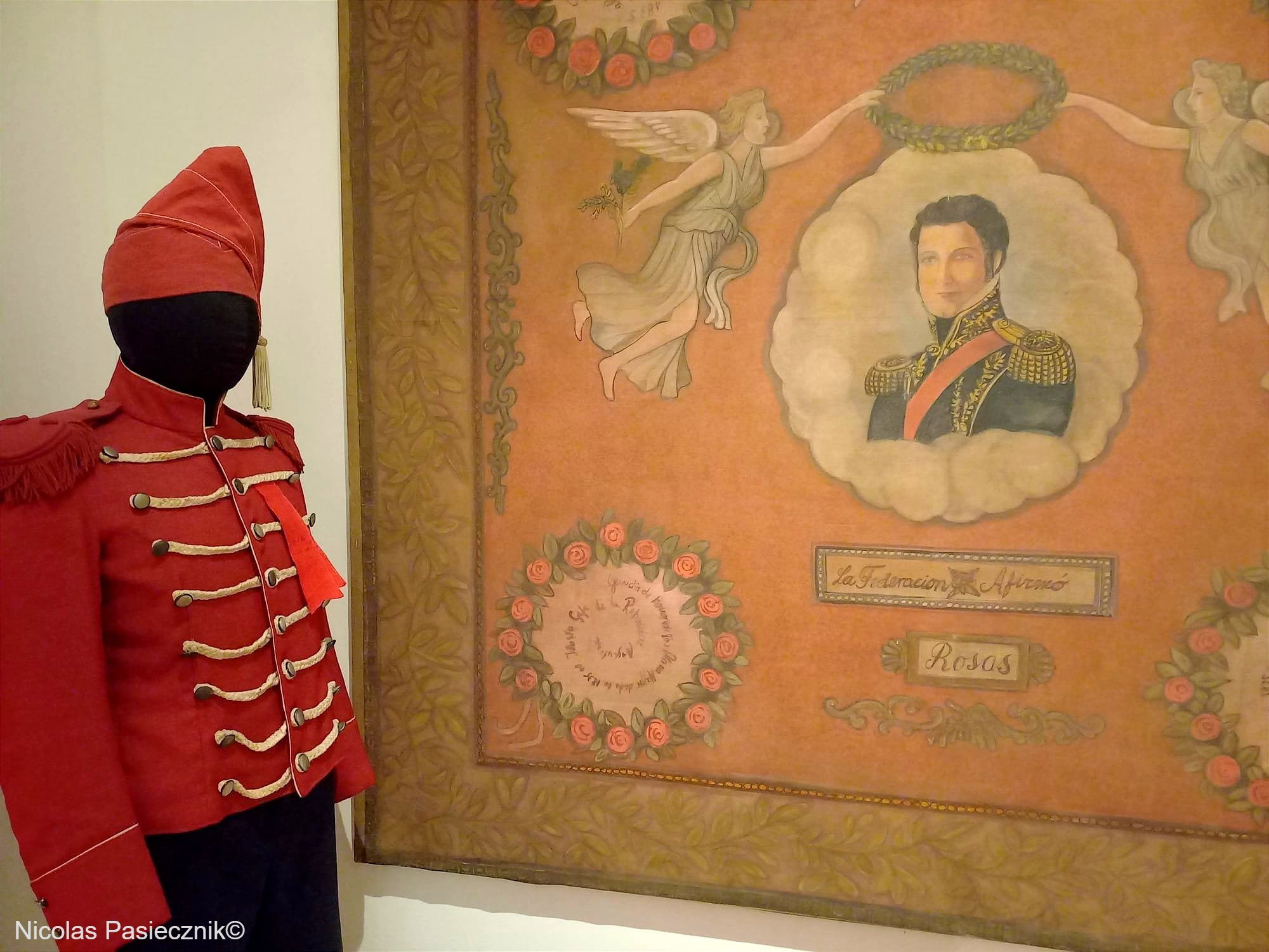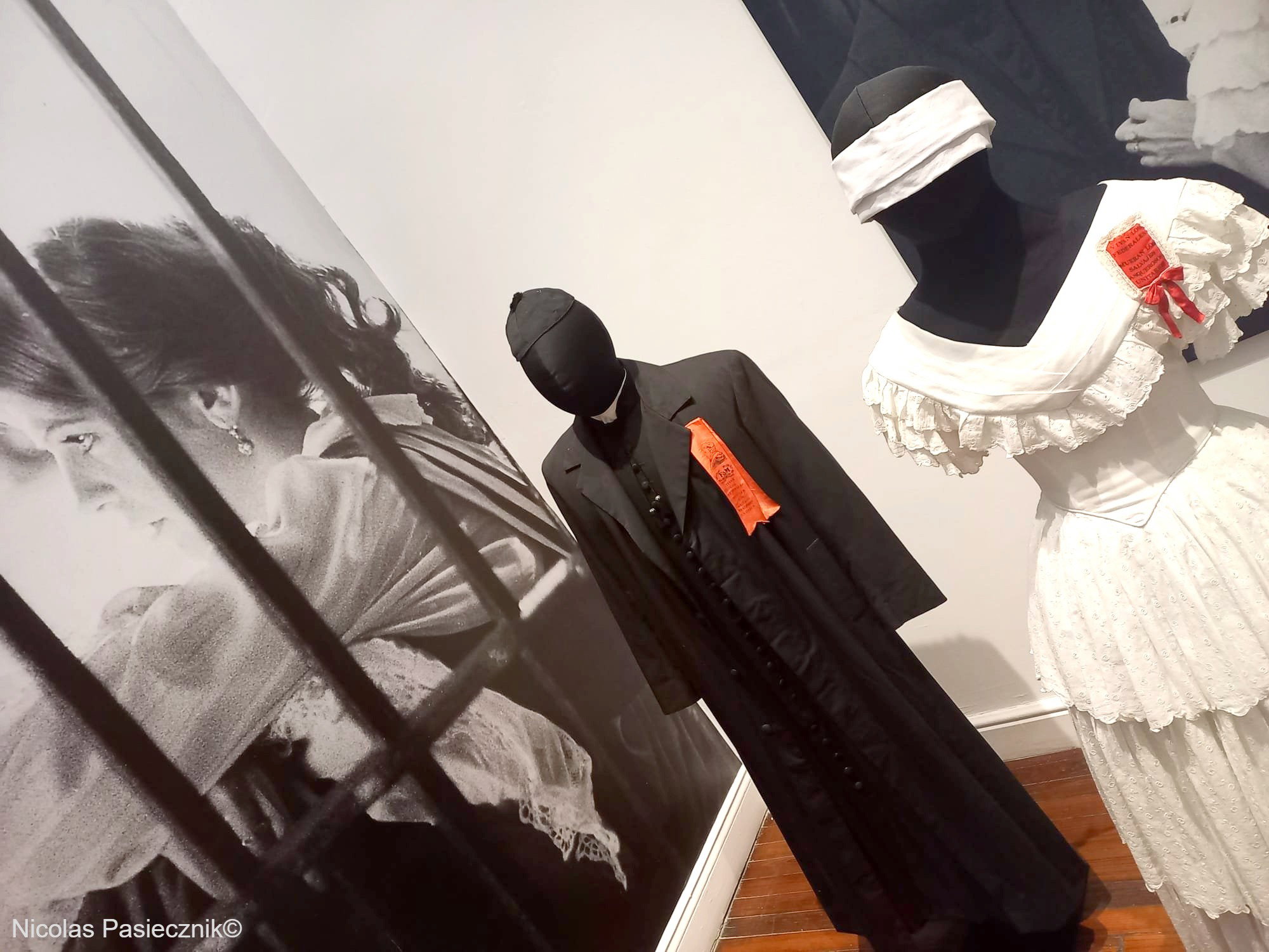 Los trajes de Camila y el cura Ladislao Gutierrez se exhiben junto a un fotograma de Susú Pecoraro