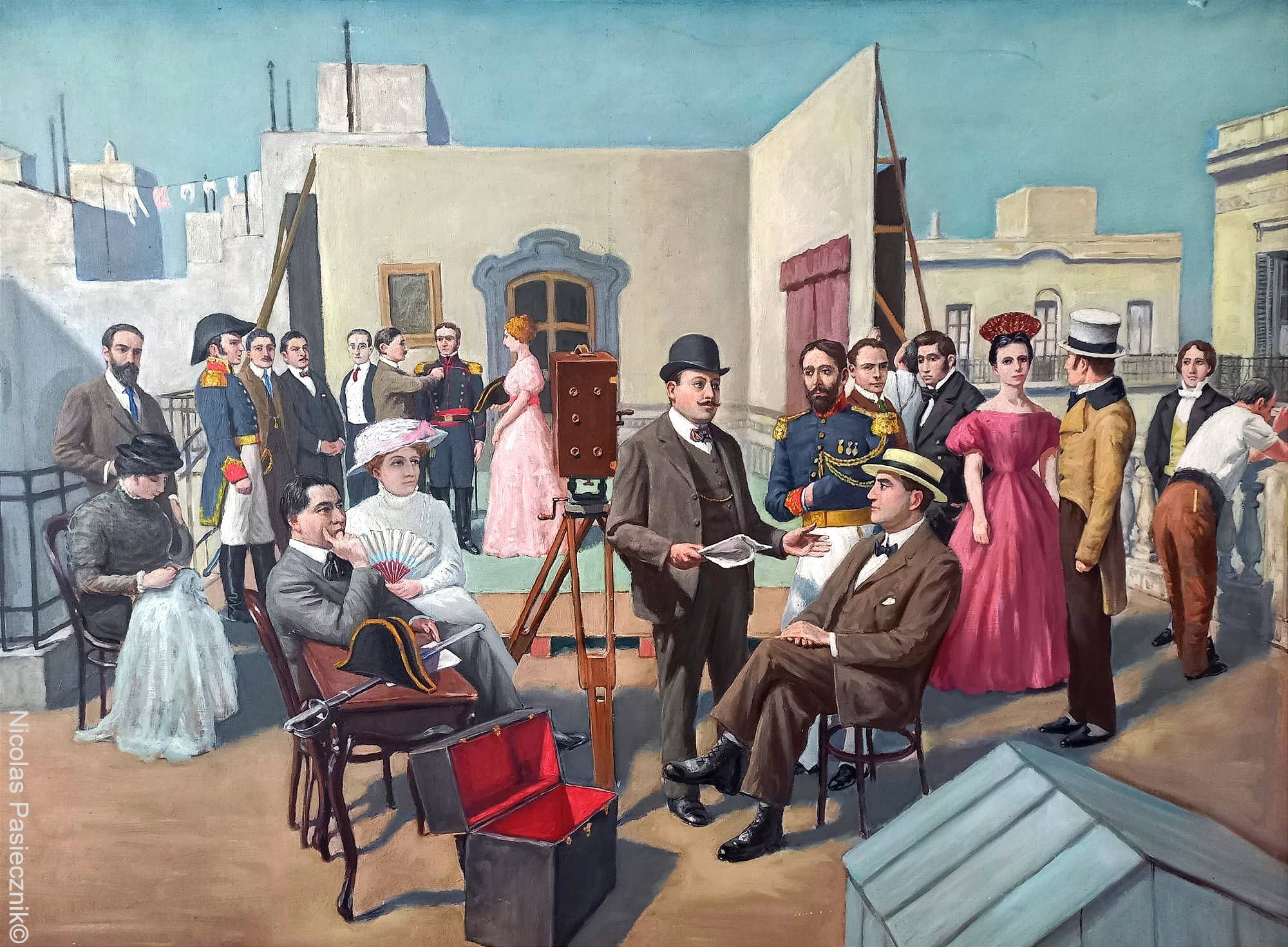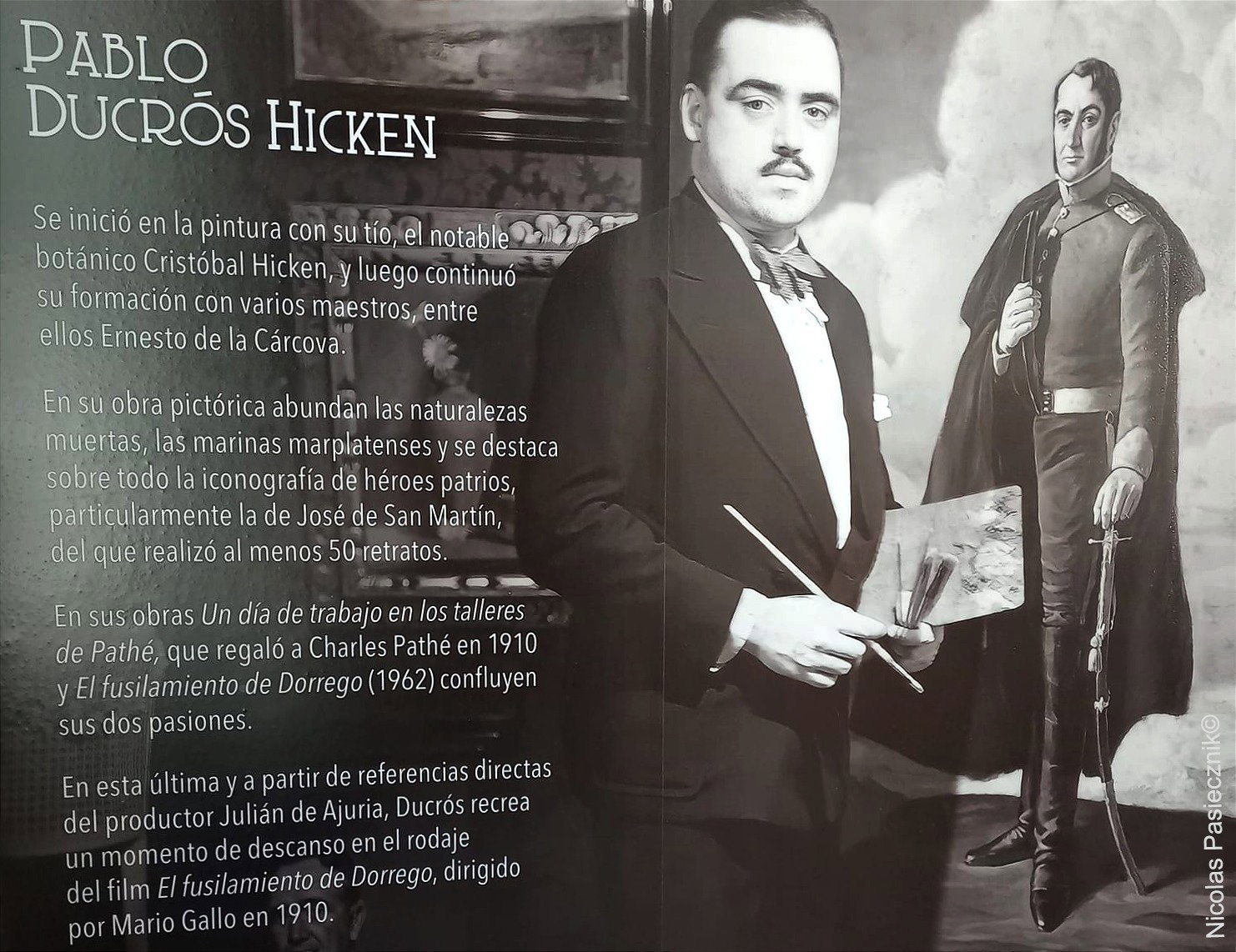 A un costado de la imagen se exhibe el cuadro de su autoria titulado "El fusilamiento de Dorrego" y en el se muestra la experiencia que vivió cuando asistió al rodaje del film del mismo nombre dirigido por Mario Gallo, el primer largometrajista de la historia del cine argentino. La filmación se llevó a cabo en la terraza del Restaurante "Spiedo" y aparecen en el centro Pablo y Blanca Podestá que asistieron a la filmación como invitados especiales.