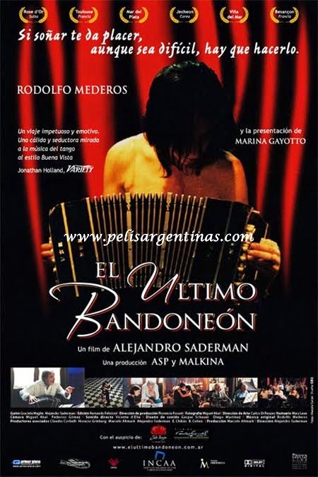 EL ULTIMO BANDONEON (Argentina-Venezuela/2005). Dirección: Alejandro Saderman, Elenco: Rodolfo Mederos, Marina Gayotto y otros. Guión: Graciela Maglie y Alejandro Saderman, Fotografía: Miguel Abal, Música: Rodolfo Mederos. (Color, Duración: 90 minutos)
