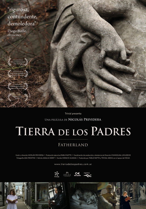 En Tierra de los padres, a través de la cámara de Nicolás Prividera, el espectador tiene la posibilidad de ingresar en el corazón mismo de la necrópolis y, a partir de una selección de textos exquisitamente elegidos y leídos por personajes destacados de la cultura, iniciar un viaje hacia la mentalidad de los argentinos. Pero lo que más sorprende de la puesta es que la mayoría de esos textos son leídos en las tumbas o bóvedas donde reposan los restos del autor elegido, dando la idea de interpelación y enfrentamiento con aquello que alguna vez el personaje pensó o sintió y que, lejos de perderse en el viento, pasó a formar parte de las construcciones mentales de una época y que definieron, de manera inevitable, la de todos los que en algún momento habitaron este país.