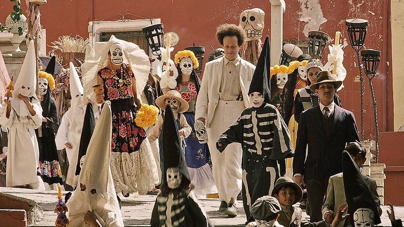 Pero sin lugar a dudas el gran planteo del film gira sobre dos ejes fundamentales: uno de ellos es el de la muerte, esa a la que él tanto temía y que, por ello, se ve seducido por la mirada mexicana ya que para ellos la muerte es la puerta de acceso a la verdadera vida y es lo que justifica no sólo la concepción ideológica y religiosa de la misma sino, además, los rituales que llevan a cabo cada 2 de noviembre y que tan famosos los ha vuelto. Y por el otro lado, como contrapartida, el eje que se encuentra en el lado opuesto y que más lo humaniza es la postura que toma frente a ese amor que aparece, de un modo que él jamás hubiera imaginado y que habla de su apertura mental y cultural ya que lo vive de un modo libre y sin temor a que dirán los pueblerinos.